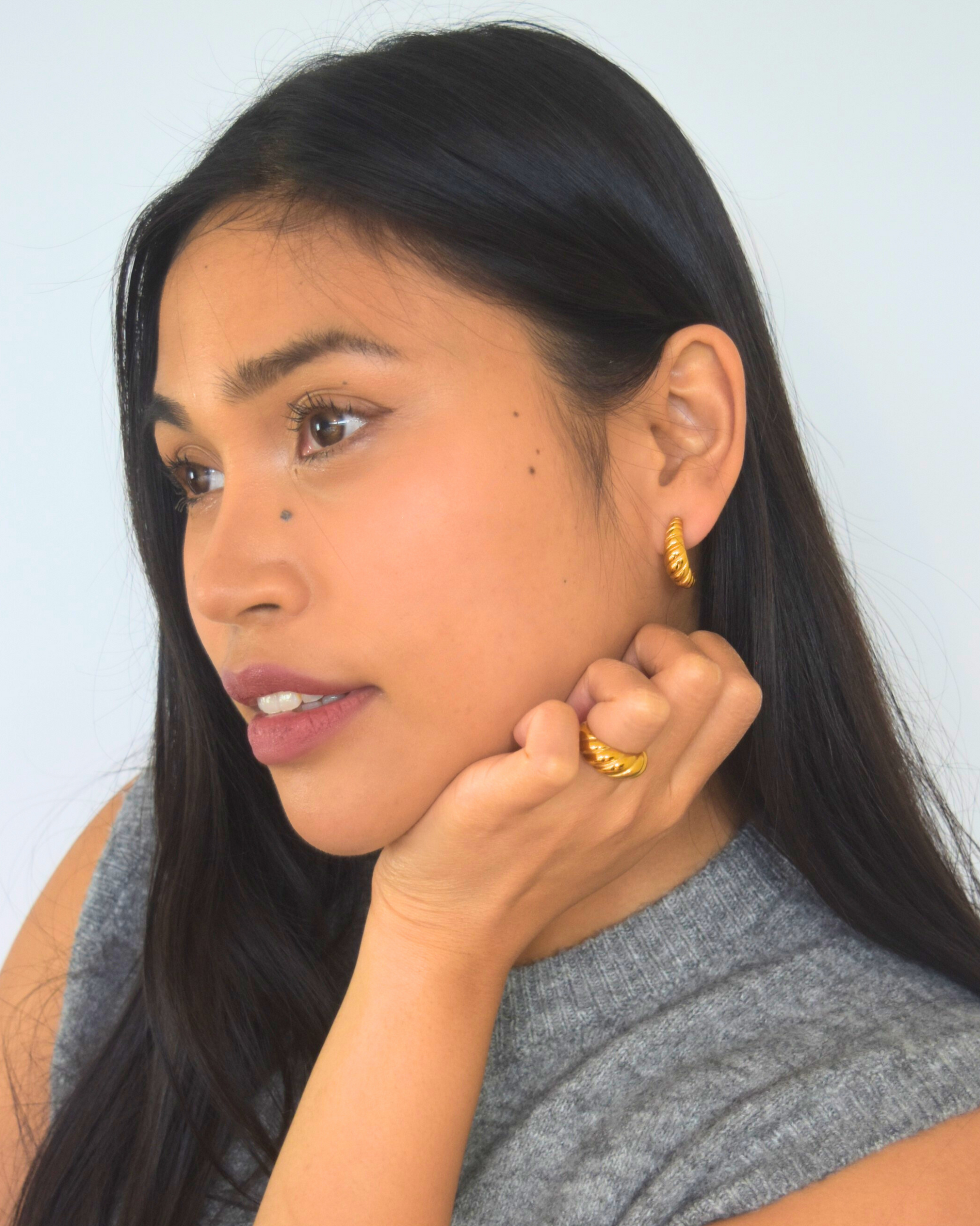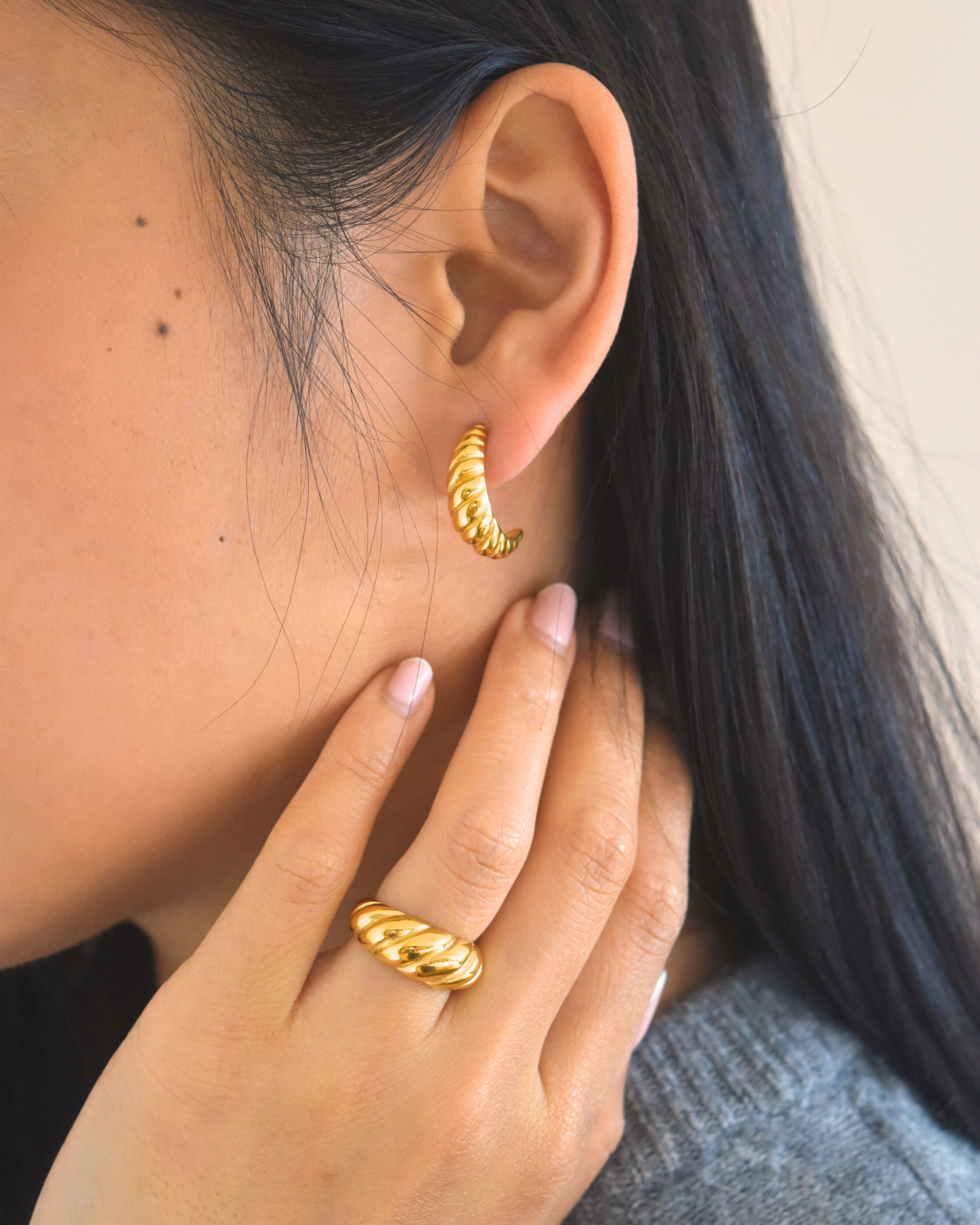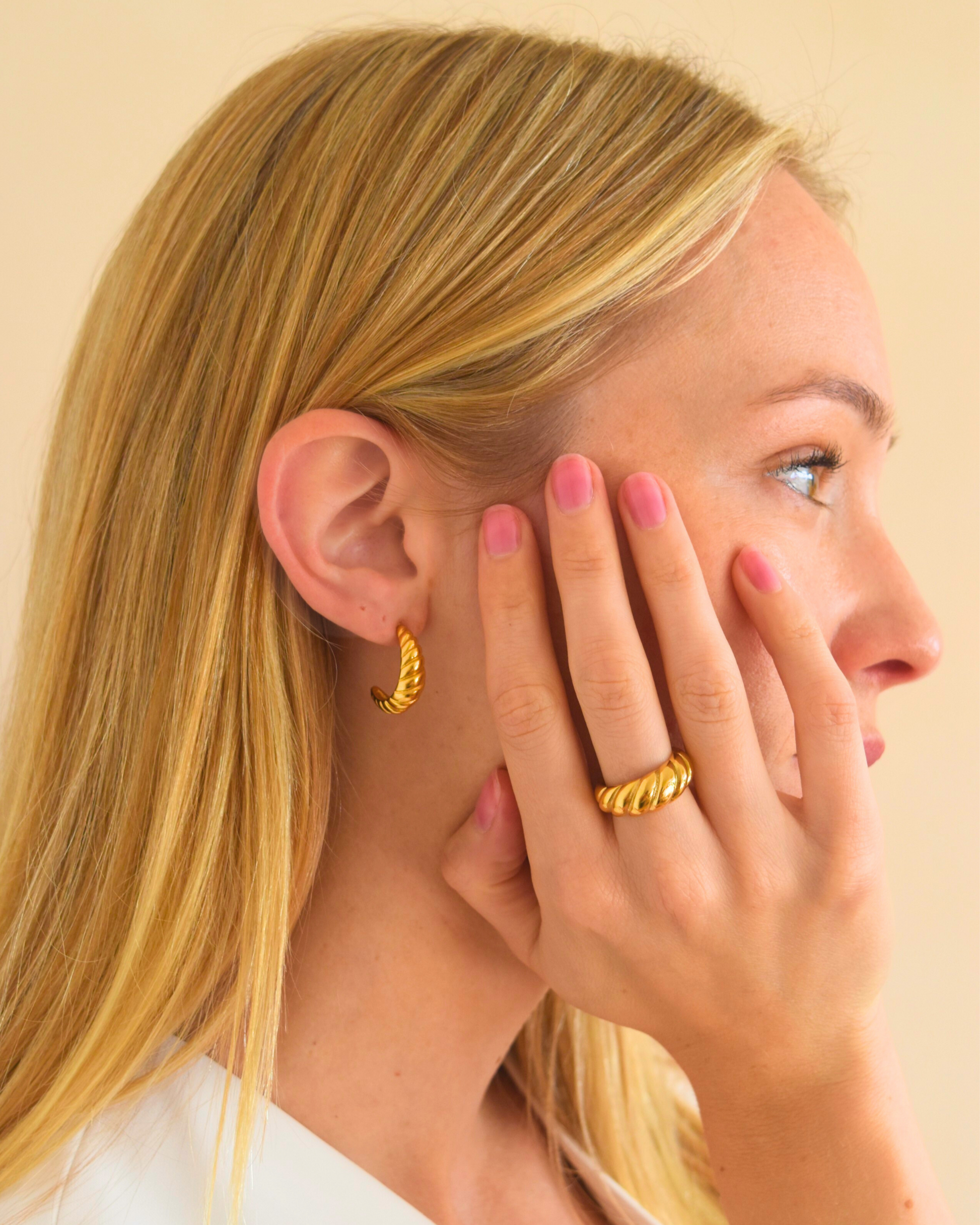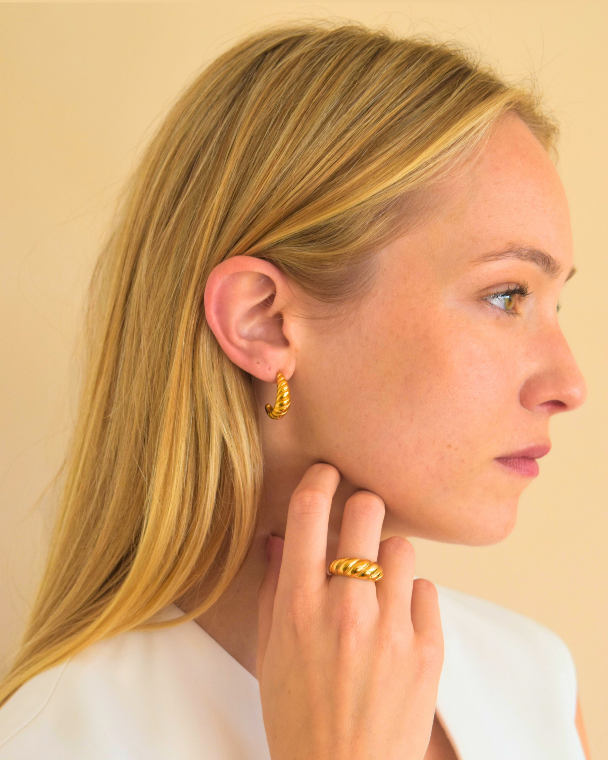 De Croisscent Set verenigt twee iconische vormen: de spiraal van de oorbellen en de vloeiende lijnen van de ring. Geïnspireerd op de maansikkel en de gelaagdheid van een croissant, symboliseren ze samen groei, beweging en elegantie. Een tijdloos duo dat krachtig én verfijnd oogt.