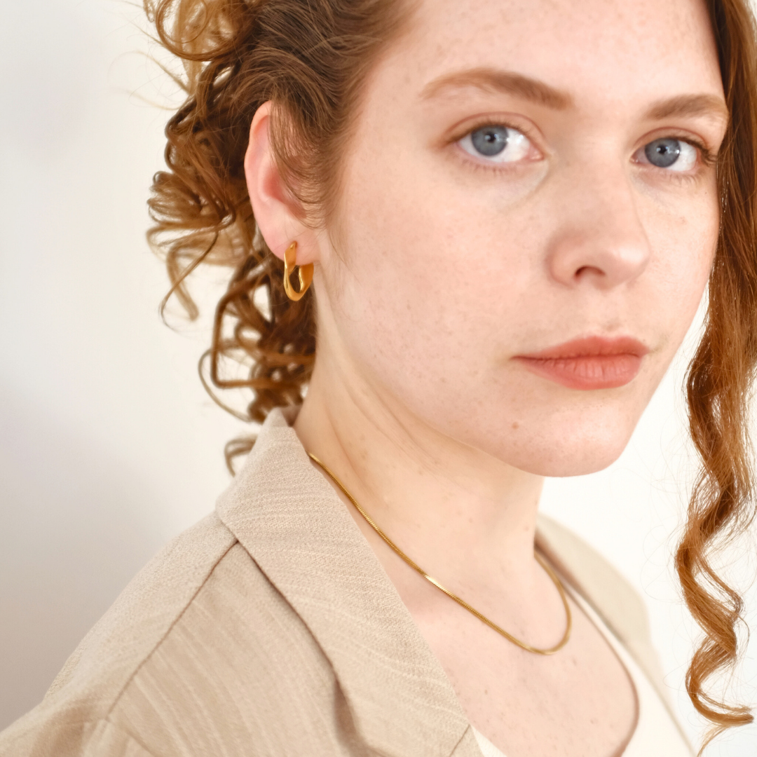 De Rivelle Hoops zijn geïnspireerd op de vloeiende beweging van water en linten. Hun golvende, afgevlakte ontwerp geeft een organisch en elegant accent aan elke look. Een speels detail met een verfijnde afwerking.